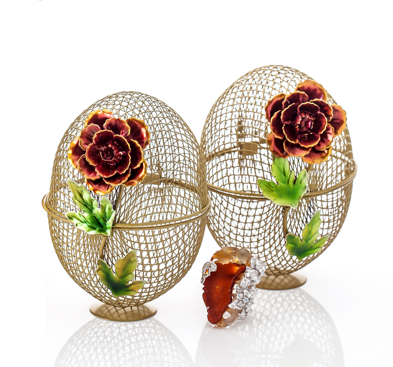 此款【富貴花】外型為蛋形,掐絲工法製成,搭配鐵片牡丹花工藝品裝飾,小巧精緻