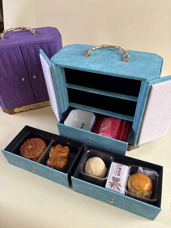 禮盒採小八角造型、金屬竹節手把的設計意寓了竹步高升,三層抽屜可作為飾品收納的用途,稜格紋車線優雅隱現新古典氣息。